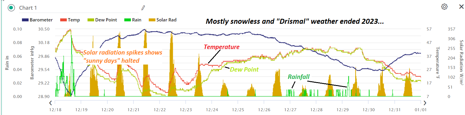 Two-week lookback at climatology in Worcester Vermont (WORV1) shows the unusually mild snowless end for 2023. Drizzle misty and gray dreary weather with lots of fog finally has transitioned to “Snizzle” or frozen drizzle which can be seen with dark clothing as it lands… Posted on January 1, 2024 by Weathering Heights
