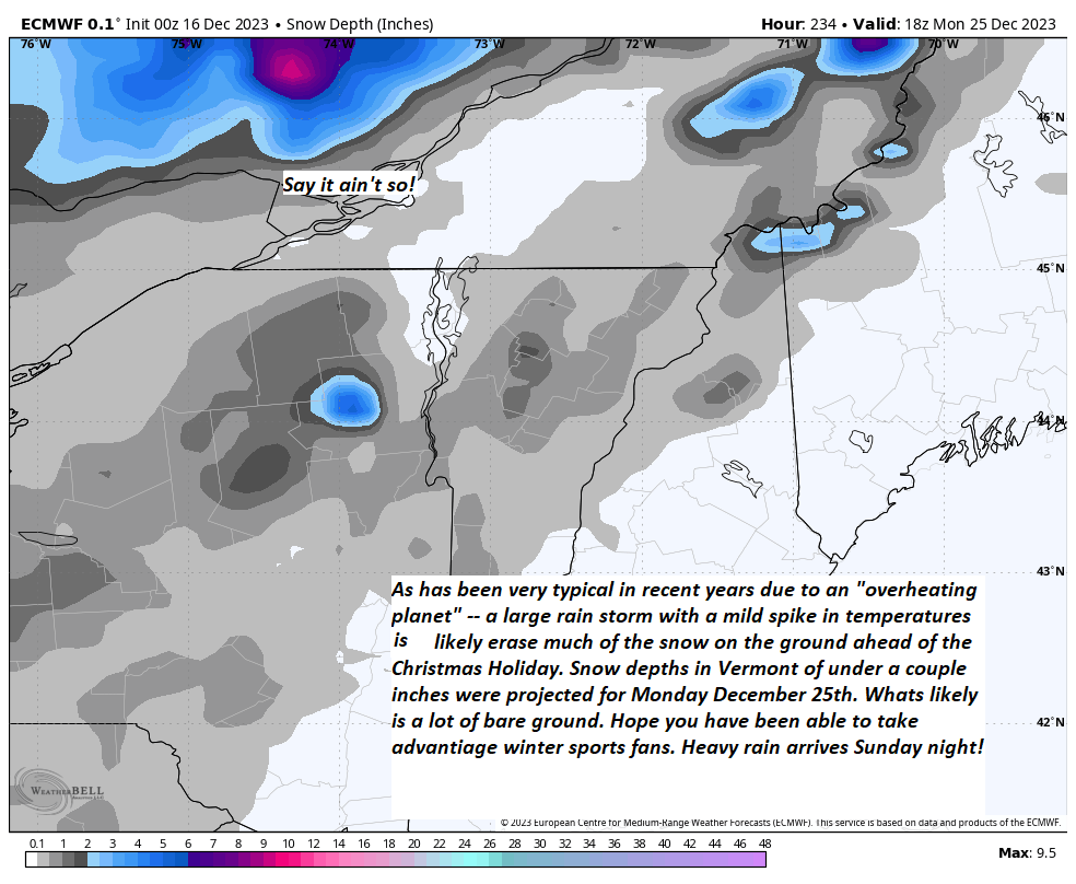 Pre-Christmas rainfall on track with potential for river rises and flooding — Sunday night into Monday. Additionally, gusty winds may be in play on mountain summits and western slopes of the Greens.