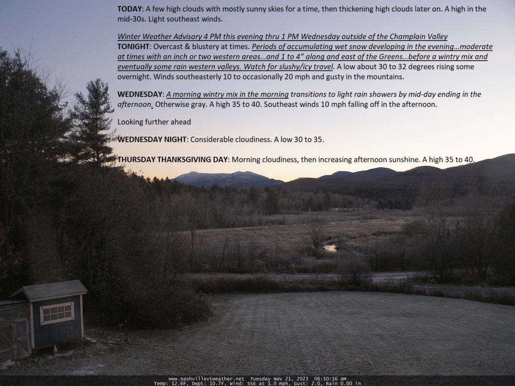 Incoming travel issues begin as snow pushes in later this evening, with a wintry mix eventually going over to rain showers. A couple/few inches of snow will be wet and slushy, the most eastern areas especially Windsor-Windham counties