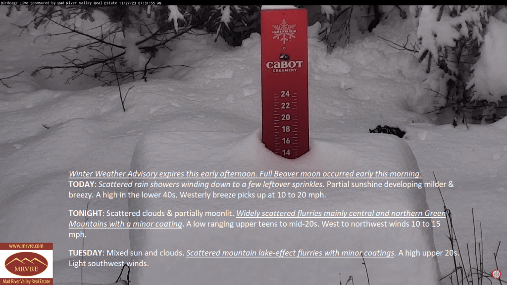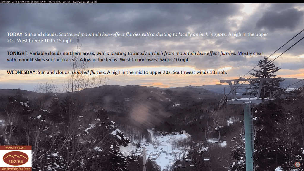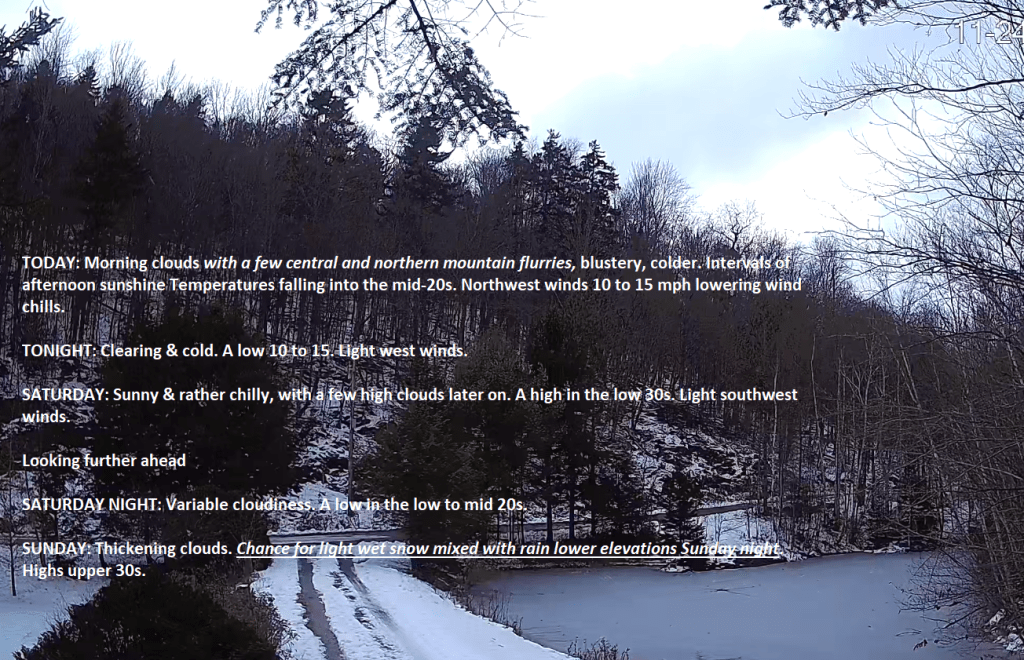Lake Effect Flurries today, tonight, and lesser amounts Wednesday which may accrue to around an inch or so in some spots northern/central Green Mountains. Colder today, and tomorrow, then a nice uptick in temps.