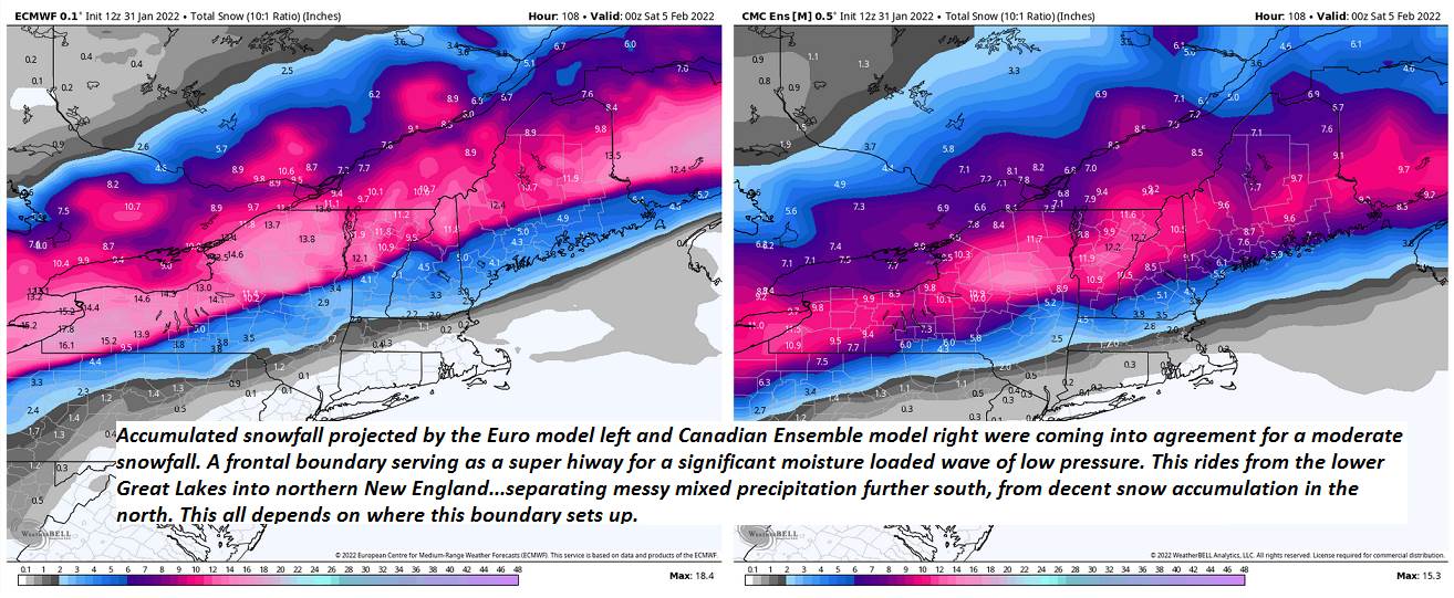 TUESDAY: Clouds with a few breaks of sun in the afternoon. A few stray flurries possible toward New Hampshire. A high 32 to 35. Light north to northwest winds.