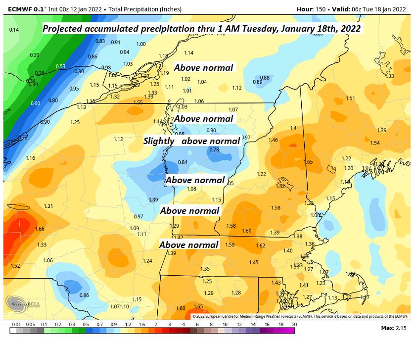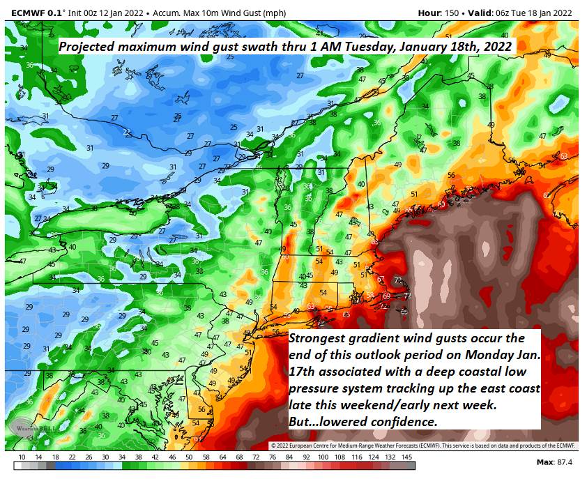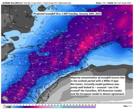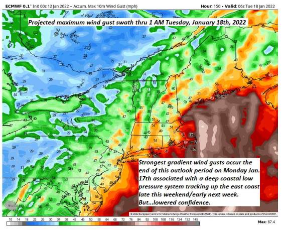 MONDAY Martin Luther King Jr. Day: Overcast. Chance for accumulating snow…moderate to briefly heavy at times, around 5 to 9” with more possible toward the southern Greens near a foot. Becoming blustery from the east northeast. A high in the low to mid 30s.