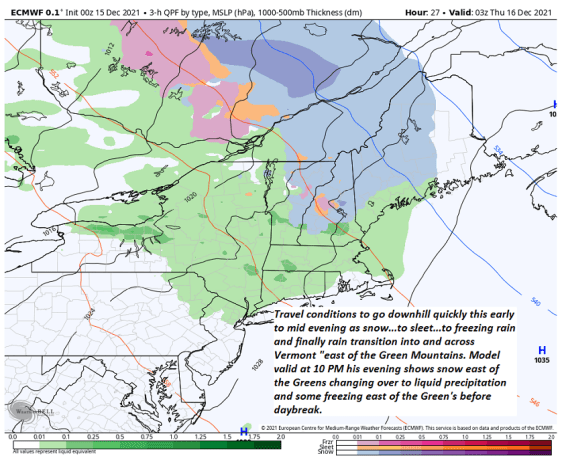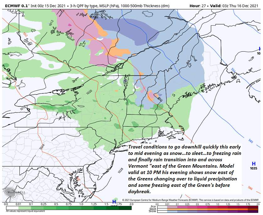 TONIGHT: Overcast. Rain, or a wintry mix will produce areas of slick travel developing early to mid-evening. Snow/sleet accumulations up to about an inch in and east of the Green Mountains. A low in the lower 30s. South winds pick up 10 to 15 mph.
