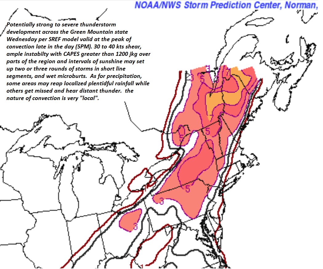 TOMORROW: Partial morning sun then more clouds. Warm and muggy. Showers and thunderstorms likely northern areas, late morning on…spreading south becoming more numerous in the afternoon. Some storms could be strong to locally severe, with gusty winds and hail. Practice lightning safety. A high in the low 80s. Southwest breeze 10 to 20 mph, stronger near Lake Champlain.