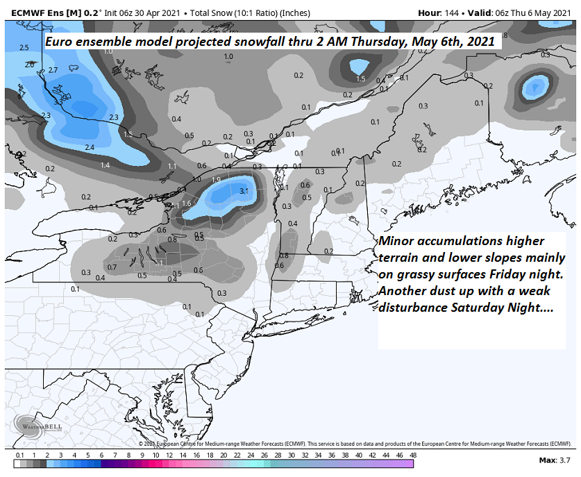 FRIDAY: Rising chance for rain or rain showers in the afternoon…possibly mixed with wet snow flakes higher terrain. A low upper 20s to near 32. A high upper 40s to near 50.