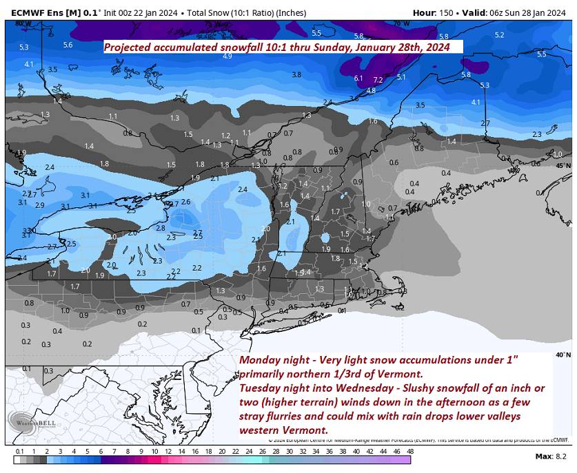 TUESDAY NIGHT: Overcast. Light snow developing south to north later in the evening with light accumulations. A low near 20.Light northeast winds.